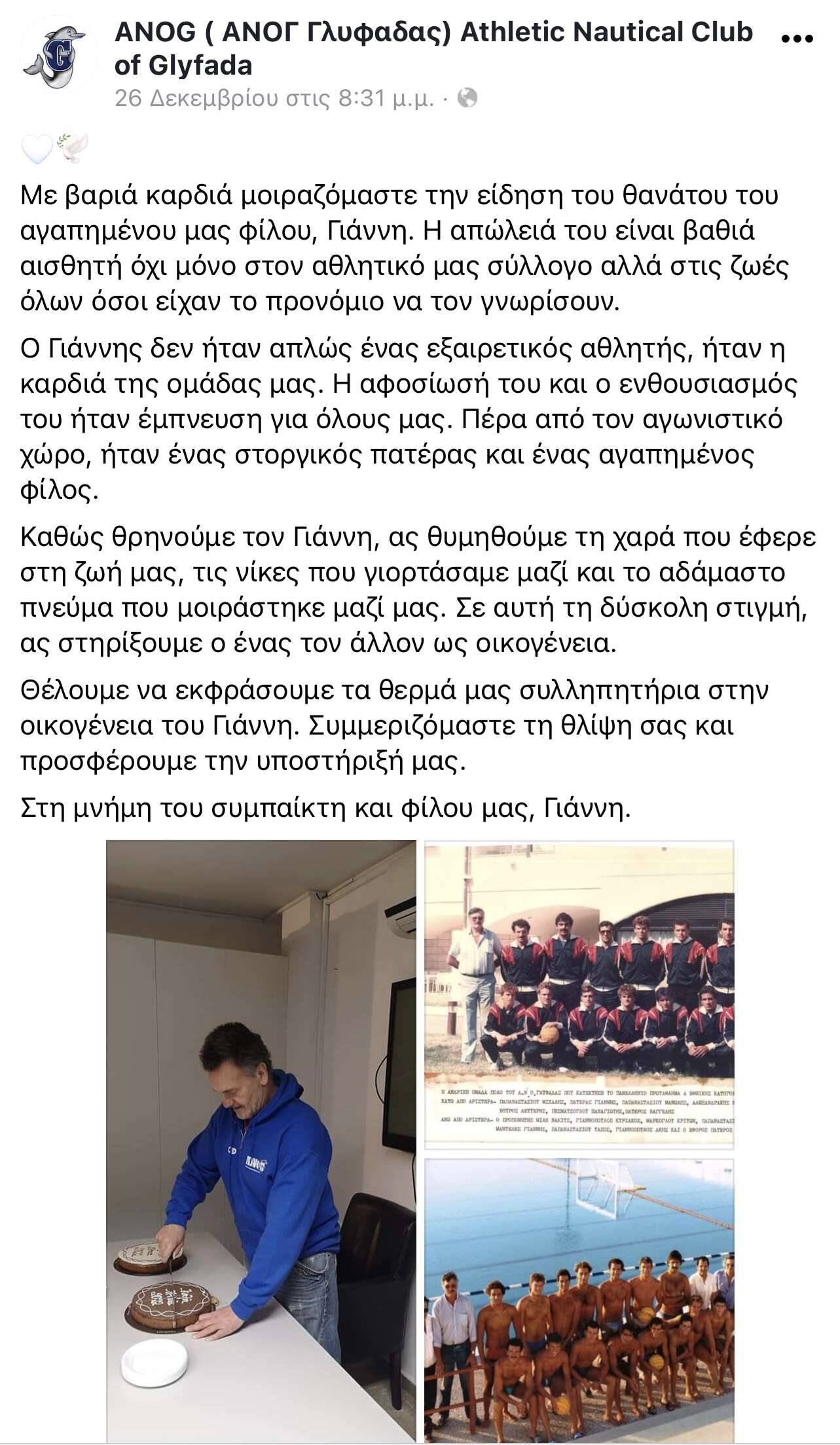 Σε ανακοίνωση που εξέδωσε ο Αθλητικός Ναυτικός Όμιλος Γλυφάδας αναφέρει: “Με βαριά καρδιά μοιραζόμαστε την είδηση του θανάτου του αγαπημένου μας φίλου, Γιάννη. Η απώλειά του είναι βαθιά αισθητή όχι μόνο στον αθλητικό μας σύλλογο αλλά στις ζωές όλων όσοι είχαν το προνόμιο να τον γνωρίσουν.