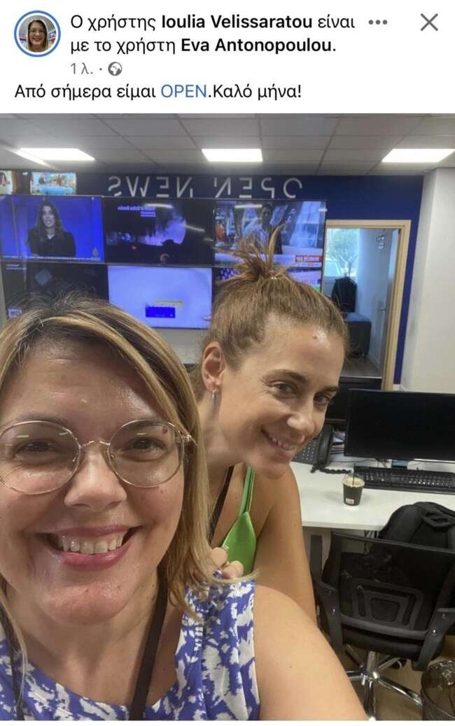 Η Ιουλία Βελισσαράτου ανακοίνωσε με μία φωτογραφία την μεταγραφή της στο Open από την αίθουσα σύνταξης και πόζαρε με τη νέα παρουσιάστρια των δελτίων ειδήσεων του σταθμού, Εύα Αντωνοπούλου.