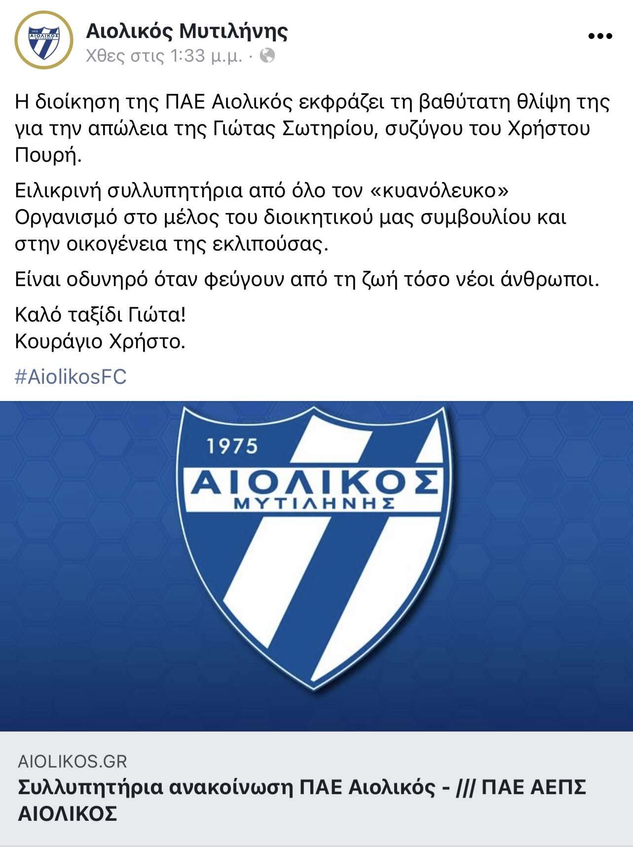 Η διοίκηση της ΠΑΕ Αιολικός εκφράζει τη βαθύτατη θλίψη της για την απώλεια της Γιώτας Σωτηρίου, συζύγου του Χρήστου Πουρή.