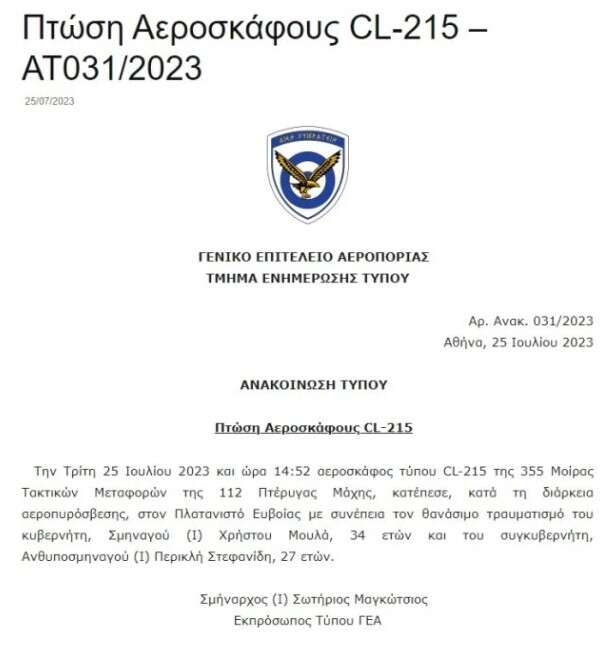 Την Τρίτη 25 Ιουλίου 2023 και ώρα 14:52 αεροσκάφος τύπου CL-215 της 355 Μοίρας Τακτικών Μεταφορών της 112 Πτέρυγας Μάχης, κατέπεσε, κατά τη διάρκεια αεροπυρόσβεσης, στον Πλατανιστό Ευβοίας με συνέπεια τον θανάσιμο τραυματισμό του κυβερνήτη, Σμηναγού (Ι) Χρήστου Μουλά, 34 ετών και του συγκυβερνήτη, Ανθυποσμηναγού (Ι) Περικλή Στεφανίδη, 27 ετών.