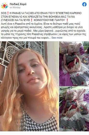 Όπως διαβάζουμε στο κείμενο της έκκλησης “Αυτή είναι η Ραφαέλα από το Αγρίνιο. Είναι το δεύτερο παιδί μιας πολύ φτωχής και αξιοπρεπούς οικογένειας . Άριστη μαθήτρια με όνειρο να γίνει γιατρός για τα μικρά παιδιά .