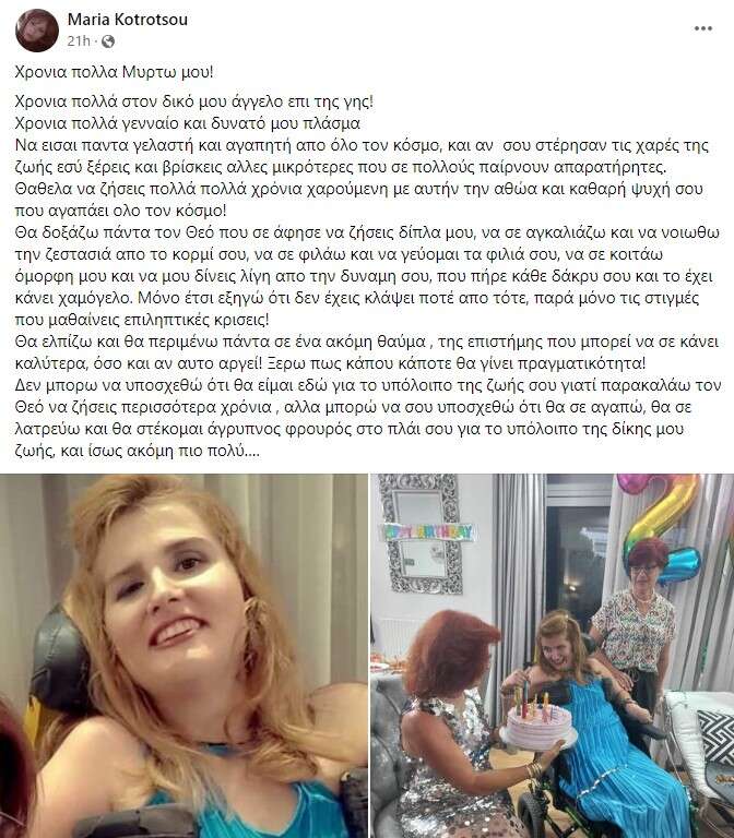 Τα γενέθλια της γιόρτασε χθες 16/7, η Μυρτώ το κορίτσι που δεν χάνει ποτέ το χαμόγελο της. Στο πλευρό της πάντα η μητέρα της, η οποία θέλησε να της ευχηθεί και δημόσια με μια ανάρτηση που λυγίζει και τους πιο δυνατούς.