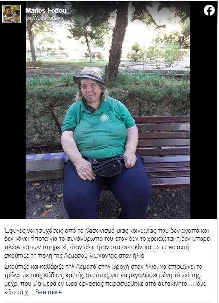 Σκούπιζε και καθάριζε την Λεμεσό στην βροχή στον ήλιο, να σπρώχνει το τρόλεϊ με τους κάδους και τής σκούπες για να μεγαλώσει τό γιό της, μέχρι που μία μέρα εν ώρα εργασίας παρασύρθηκε από αυτοκίνητο…Πάνε κάποια χρόνια και έκτοτε μέχρι σήμερα είχε πεταχτεί κυριολεκτικά σε ένα ίδρυμα όπου αφέθηκε και έγινε ένα λείψανο να μην μπορεί καν να μιλήσει σήμερα άφησε εκεί την τελευταία της πνοή ΕΝΤΕΛΏΣ ΜΌΝΗ, ο γιος της αφέθηκε στο έλεος του Θεού να πουλήσει τα πάντα, το ίδιο το σπίτι της, και πλέον είναι στους δρόμους να ζητά ελεημοσύνη, γιατί όλοι εμείς σαν κοινωνία μάθαμε να βλέπουμε μόνο τον εαυτό μας! Πόσο ντρέπομαι, αλλεπάλληλες προσπάθειες σε γραφεία αδιαφορίας του κράτους έπεφταν στο κενό…