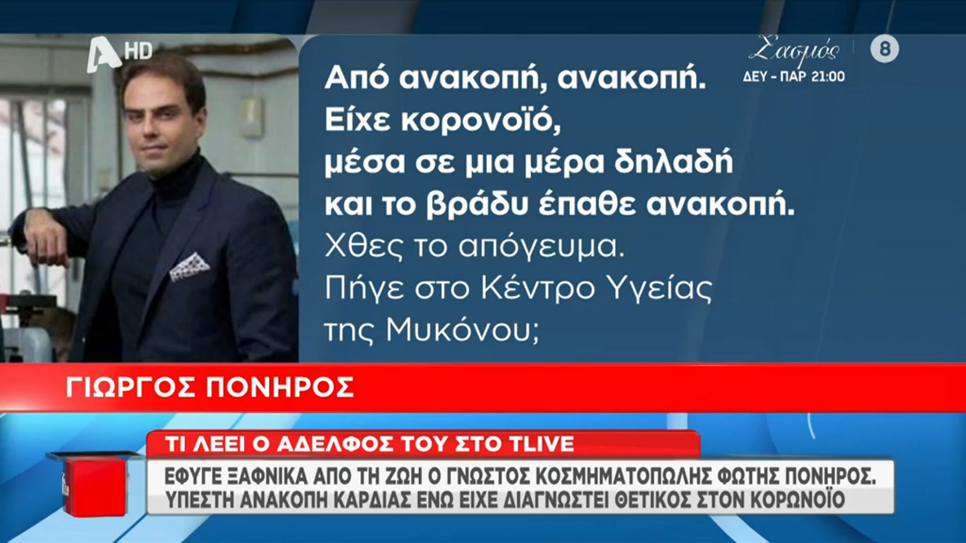 «Από ανακοπή, ανακοπή. Είχε κορονοϊό, μέσα σε μια μέρα δηλαδή και το βράδυ έπαθε ανακοπή. Χθες το απόγευμα. Πήγε έκανε ένα τεστ covid, διαγνώστηκε θετικός, πήγε σπίτι του, αυτό. Δεν είχε κανένα πρόβλημα, εγώ το ήξερα ότι είχε διαγνωστεί με covid, με πήρε τηλέφωνο και μου το είπε και ότι θα είναι δύσκολο να πάει στη δουλειά τις επόμενες μέρες, να ανοίξει το κατάστημα της Μυκόνου. Ήταν στο κρεβάτι, θα καθόταν δυο, τρεις μέρες, όσο ήταν. Ένιωθε δυσφορία» ανέφερε ο Γιώργος Πονηρός.
