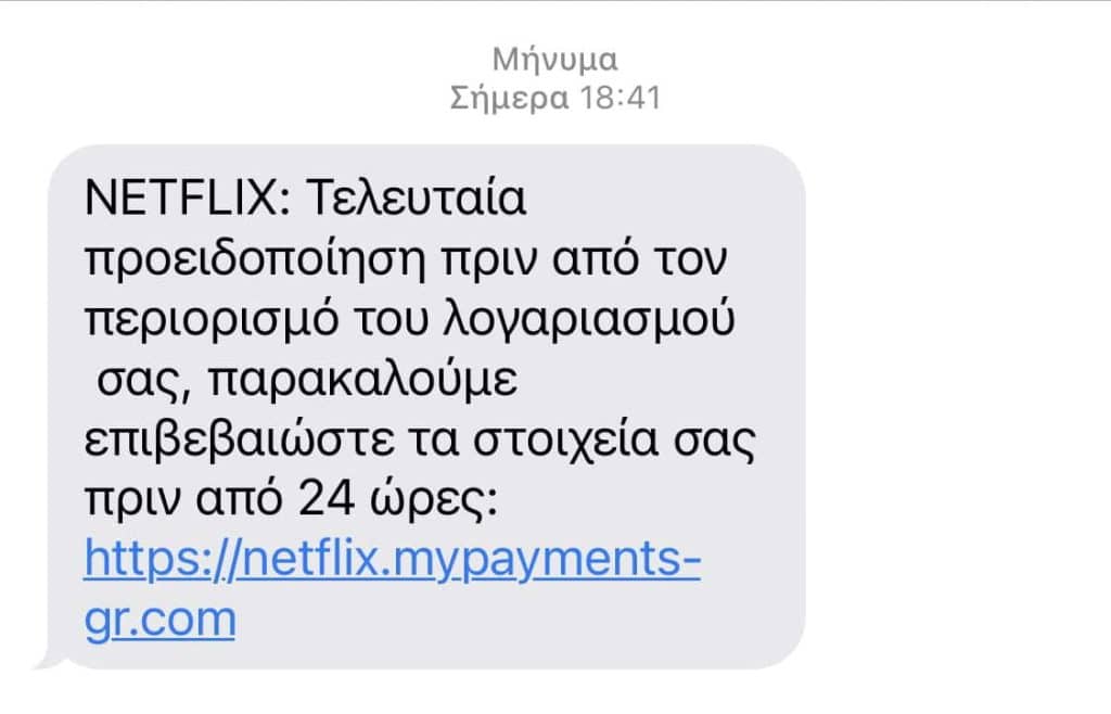 Συγκεκριμένα, δεκάδες ελληνικοί τηλεφωνικοί αριθμοί έχουν λάβει SMS, τα οποία ισχυρίζονται πως ο λογαριασμός τους στο Netflix πρόκειται να περιοριστεί, αν δεν επιβεβαιώσουν τα στοιχεία τους εντός 24 ωρών.