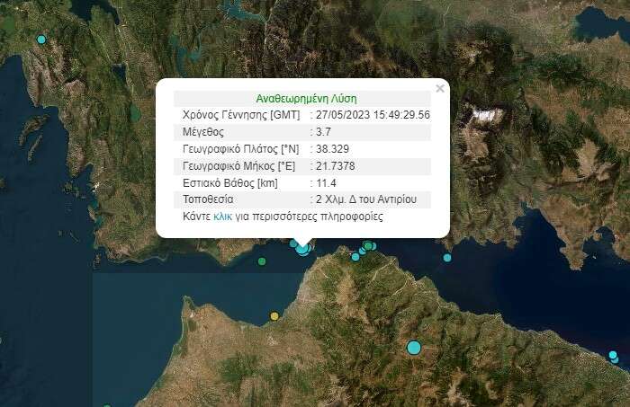 Αναστατώθηκαν οι κάτοικοι της Πάτρας και των γύρω περιοχών, καθώς σημειώθηκε σεισμική δόνηση το απόγευμα του Σαββάτου 27 Μαΐου. Σύμφωνα με την Αναθεωρημένη Λύση του Γεωδυναμικού Ινστιτούτου Αθηνών, ο σεισμός ήταν μεγέθους 3,7 Ρίχτερ, δύο χιλιόμετρα Δυτικά του Αντιρρίου.