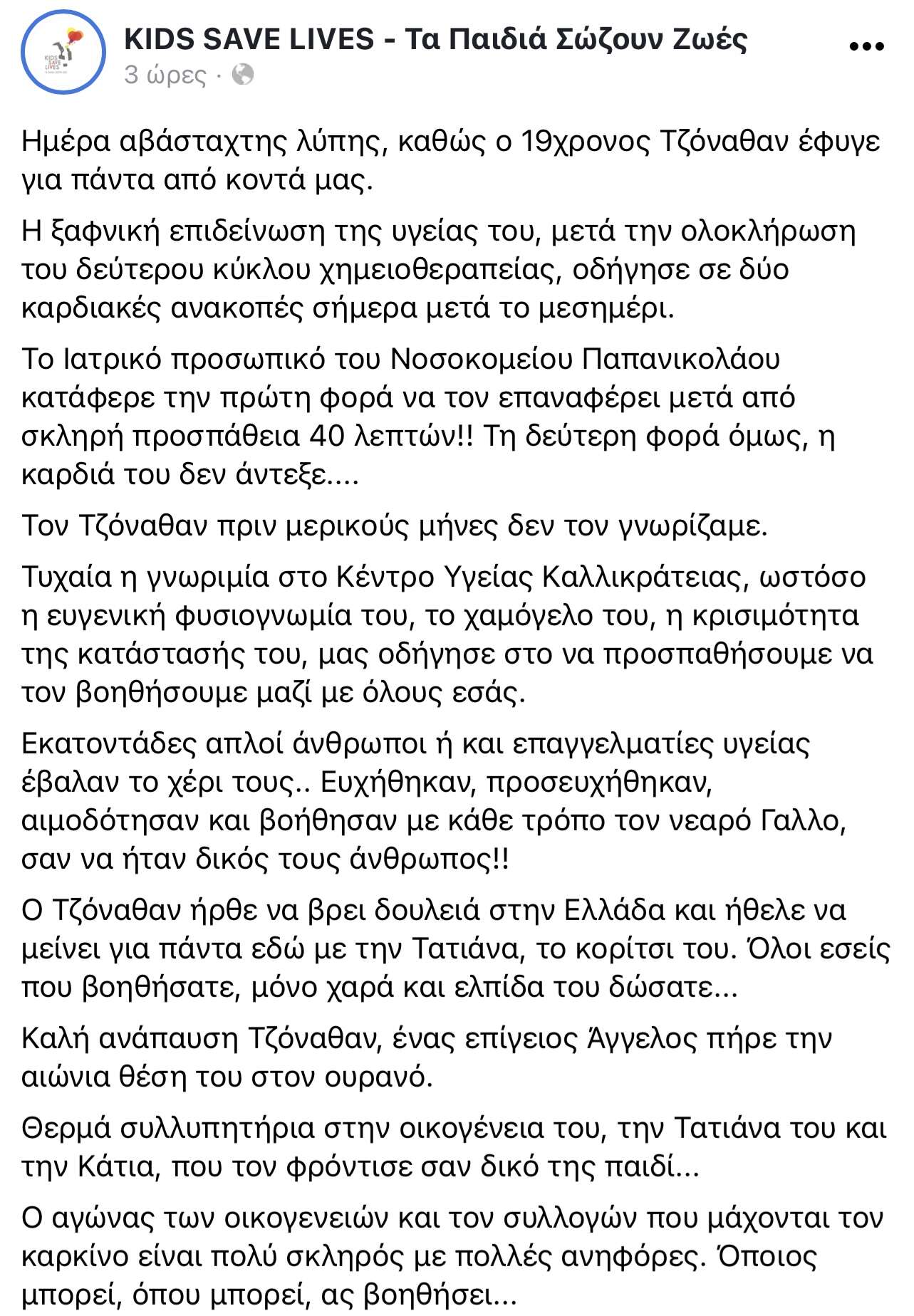 «Ο 19χρονος Τζόναθαν έφυγε για πάντα από κοντά μας», αναλυτικά η ανάρτηση