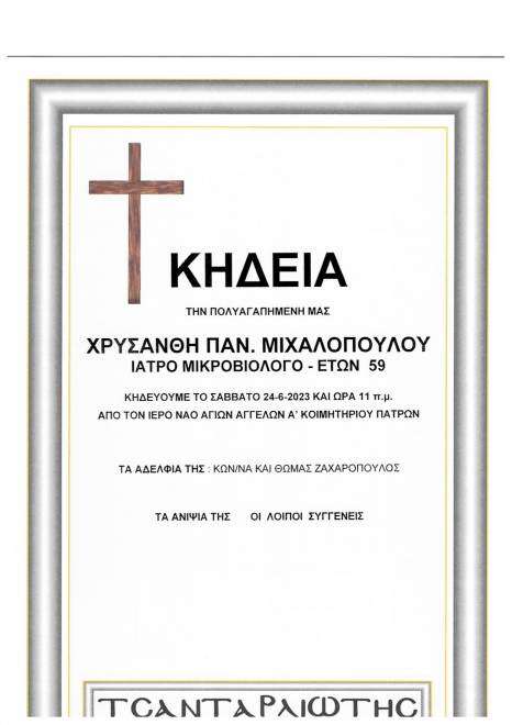 Η γιατρός Χρυσάνθη Μιχαλοπούλου από την Πάτρα άφησε την τελευταία της πνοή σε ηλικία 59 ετών. Η μικροβιολόγος αντιμετώπιζε προβλήματα υγείας, μεταφέρθηκε εκτάκτως από το σπίτι της στο Νοσοκομείο “Αγιος Ανδρέας” όμως δεν τα κατάφερε και ξεψύχησε. Θρήνος στον ιατρικό κόσμο της Πάτρας.