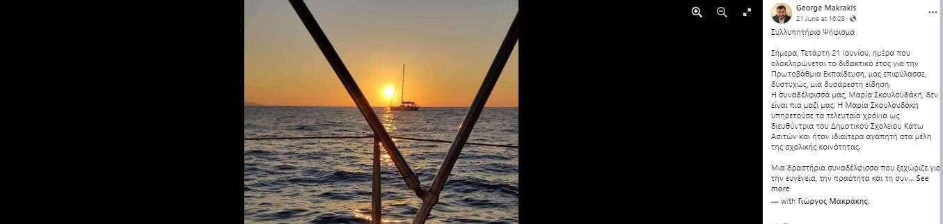 Η αγαπητή Μαρία Σκουλουδάκη που υπηρετούσε τα τελευταία χρόνια ως διευθύντρια του Δημοτικού Σχολείου Κάτω Ασιτών “έσβησε” ανήμερα της ολοκλήρωσης του διδακτικού έτους για την Πρωτοβάθμια Εκπαίδευση, σκορπώντας θλίψη με τον θάνατό της.