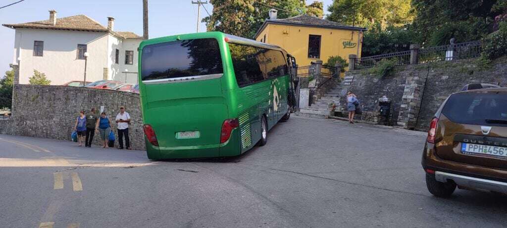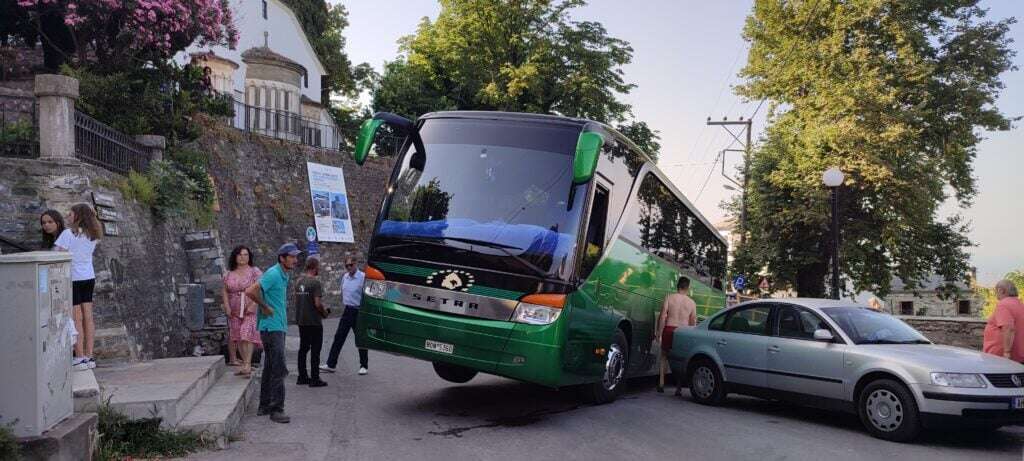 Σύμφωνα με το thenewspaper.gr ο οδηγός του λεωφορείου του Υπεραστικού ΚΤΕΛ Μαγνησίας που βρισκόταν στην Ζαγορά του Πηλίου βρέθηκε σε ένα στενό δρόμο και προσπάθησε να στρίψει.