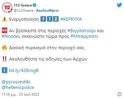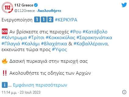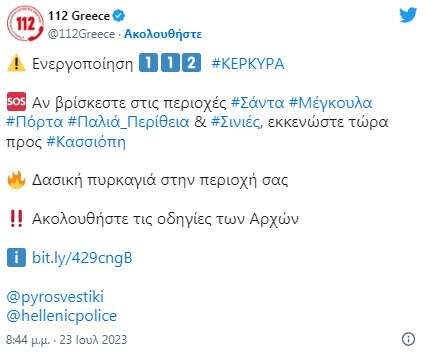 Το 112 έστειλε μήνυμα εκκένωσης σε 15 οικισμούς στην Κέρκυρα