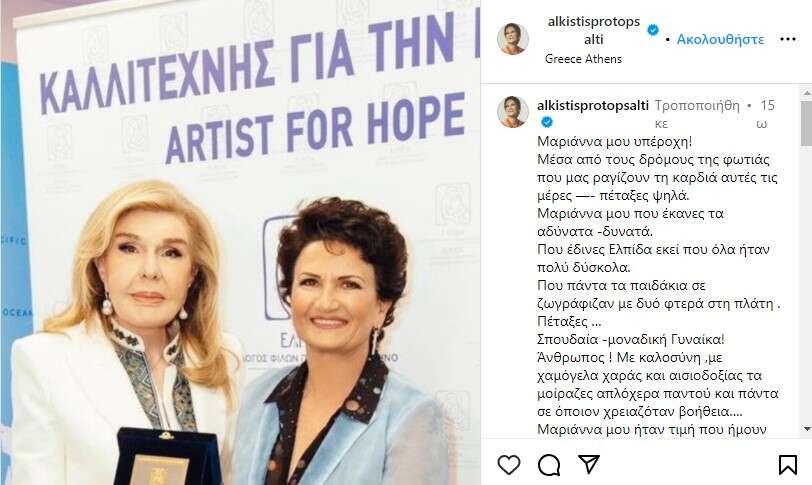Είσαι εδώ μέσα στις καρδιές των ανθρώπων και κυρίως των παιδιών . Αυτό είναι ΑΘΑΝΑΣΙΑ» έγραψε η Άλκηστις Πρωτοψάλτη για τη Μαριάννα Βαρδινογιάννη.