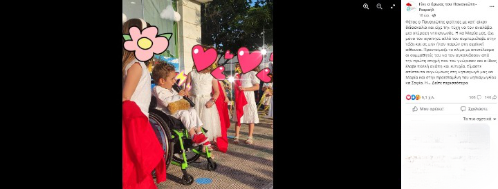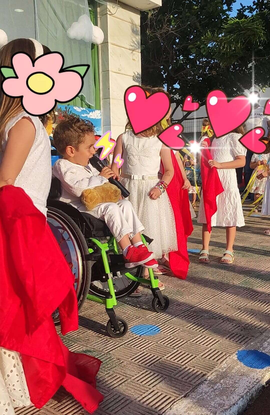 «Φέτος ο Παναγιώτης φοίτησε με κατ’ οίκον διδασκαλία και είχε την τύχη να τον αναλάβει μια υπέροχη νηπιαγωγός. Η κα Μαρία μας, όχι μόνο τον αγάπησε αλλά τον συμπεριέλαβε στην τάξη και ας μην ήταν παρών στη σχολική αίθουσα. Προετοίμαζε το κλίμα με αποτέλεσμα οι συμμαθητές του να τον αγκαλιάσουν από την πρώτη στιγμή που τον γνώρισαν και ο ίδιος έλαβε πολλή αγάπη και ευτυχία. Είμαστε απίστευτα ευγνώμονες στη νηπιαγωγό μας κα Μαρία και στην προϊσταμένη του νηπιαγωγείου κα Σοφία. Η φωτογραφία είναι από τη καλοκαιρινή γιορτή του σχολείου, όπου ο μικρός μας είπε το ποίημα του με πολλή χαρά γιατί ένιωθε ότι τον αγαπούν και τον αποδέχονται. Η συμπερίληψη και το αίσθημα του ανήκειν είναι πολύ σημαντικά για την ψυχική υγεία όλων των παιδιών. Ανυπομονούμε για την καινούρια χρονιά που θα βρει επιτέλους τον Παναγιώτη μας στη σχολική αίθουσα! Καλό καλοκαίρι σε όλους!».