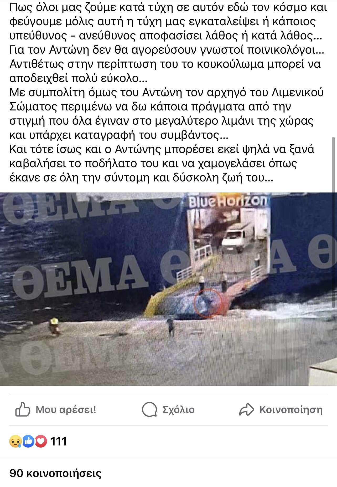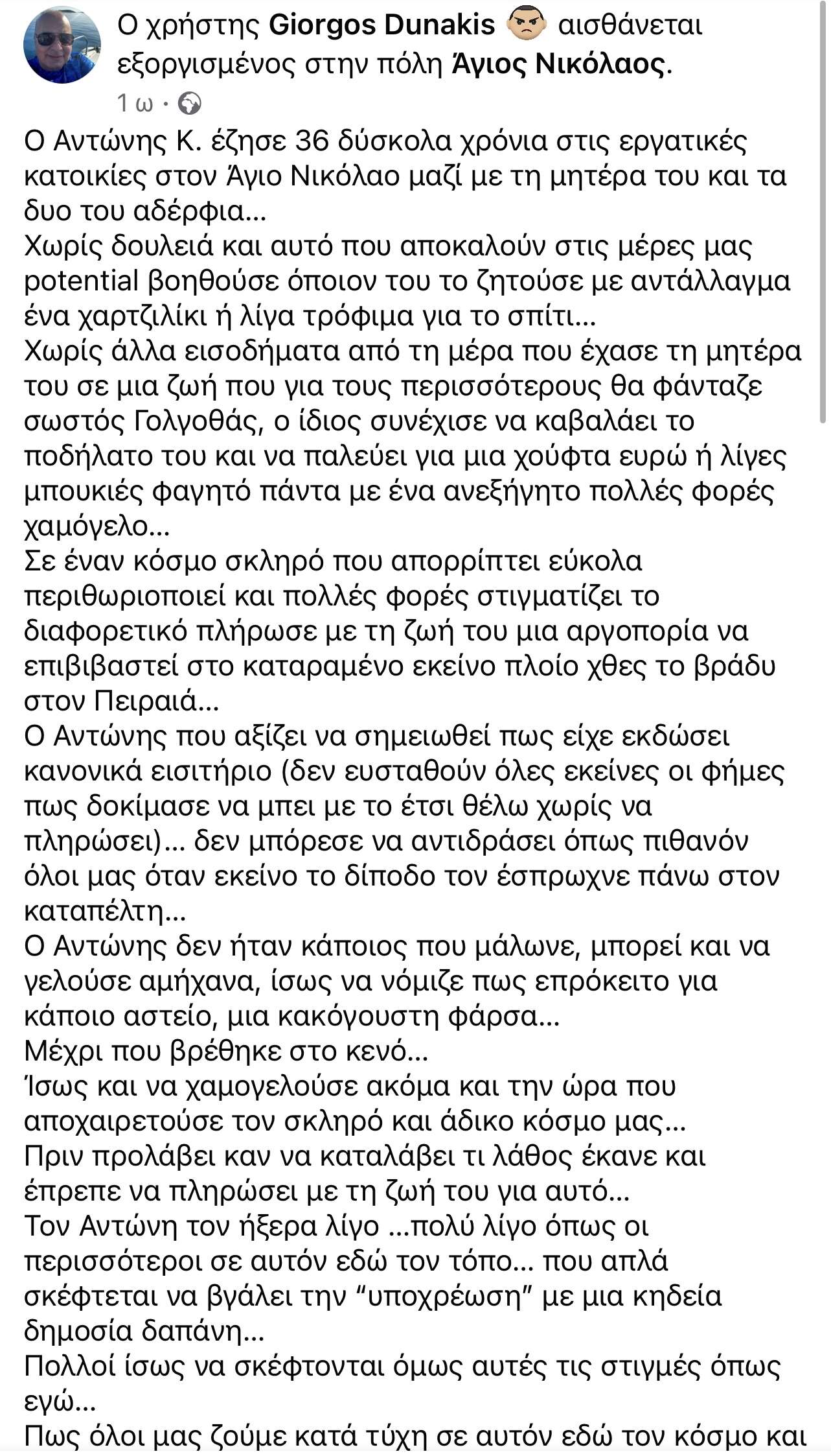 Σε μία συγκλονιστική ανάρτηση για τον άδικο χαμό του 36χρονου Αντώνη Καρυώτη στο λιμάνι του Πειραιά, προχώρησε ένας άνθρωπος που τον γνώριζε.