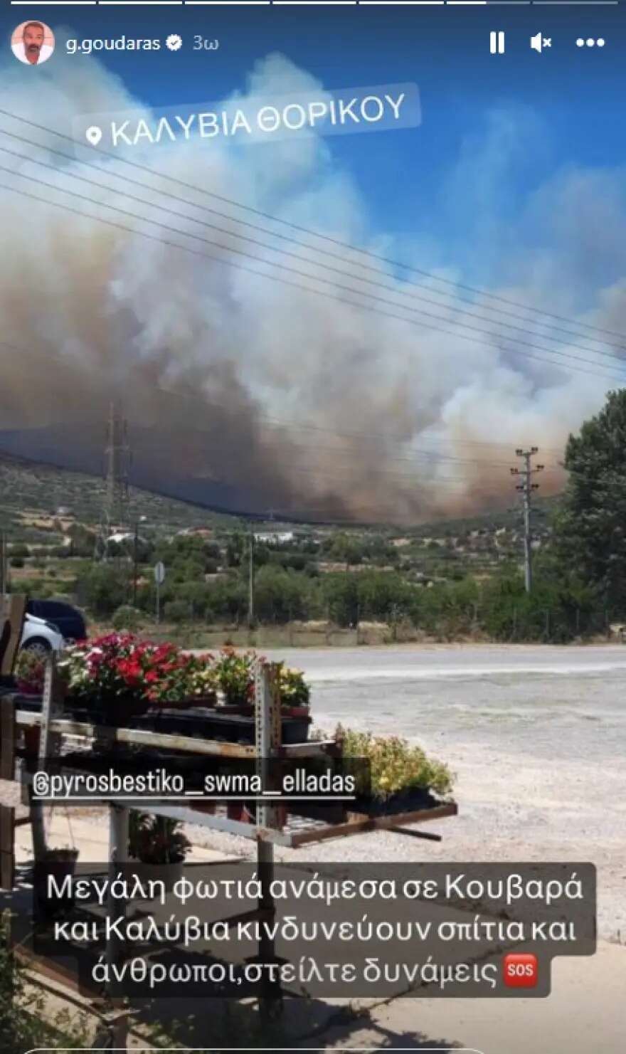 «Μεγάλη φωτιά ανάμεσα σε Κουβαρά και Καλύβια, κινδυνεύουν σπίτια και άνθρωποι, στείλτε δυνάμεις» έγραψε αρχικά ο Γρηγόρης Γκουντάρας.