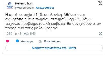 Η αμαξοστοιχία 51 (Θεσσαλονίκη-Αθήνα) είναι ακινητοποιημένη πλησίον σταθμού Θερμών, λόγω τεχνικού προβλήματος.