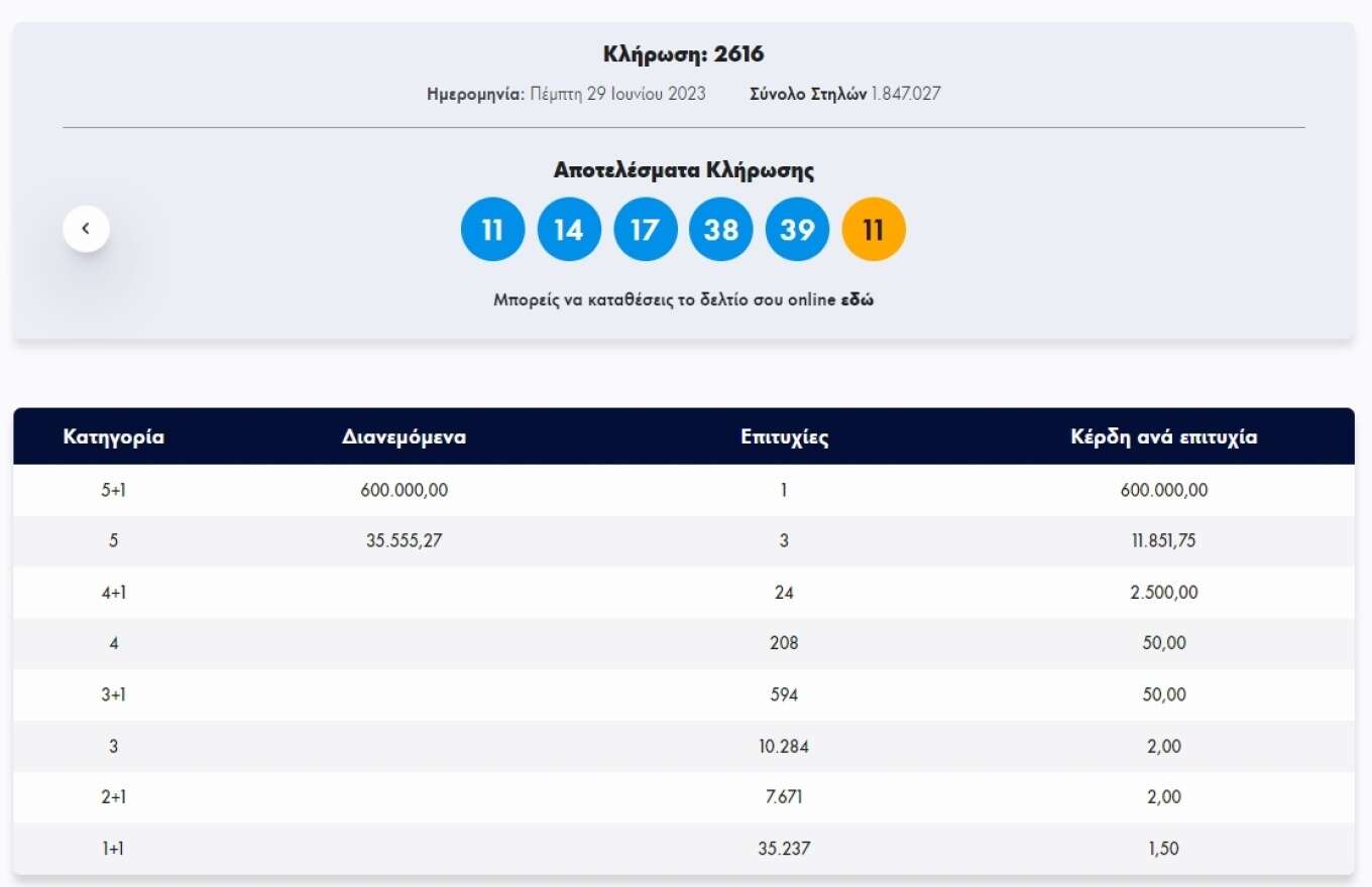 Έναν νικητή που κερδίζει 600.000 ευρώ ανέδειξε η κλήρωση του Τζόκερ σήμερα.
