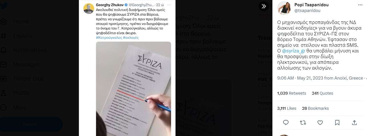 «Ο μηχανισμός προπαγάνδας της ΝΔ διακινεί «οδηγίες» για να βγουν άκυρα ψηφοδέλτια του ΣΥΡΙΖΑ-ΠΣ στον Βόρειο Τομέα Αθηνών. Έφτασαν στο σημείο να στείλουν και πλαστά SMS. Ο @syriza_gr θα υποβάλει μήνυση και θα προσφύγει στην δίωξη ηλεκτρονικού εγκλήματος, για απόπειρα αλλοίωσης των εκλογών».