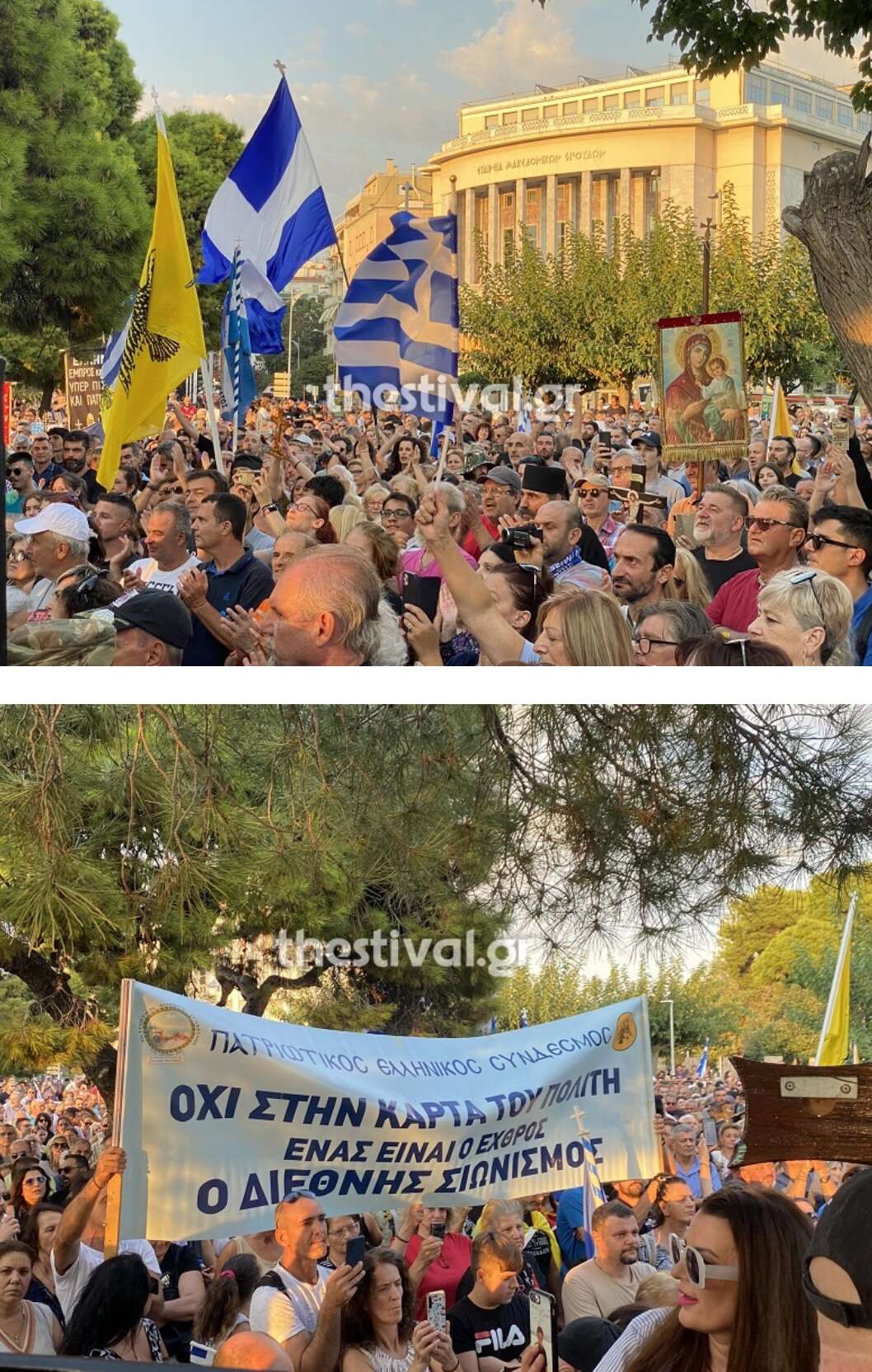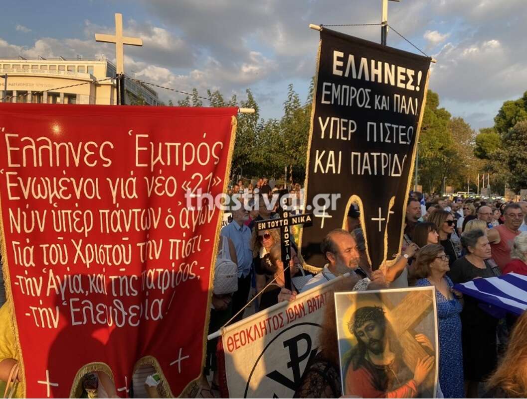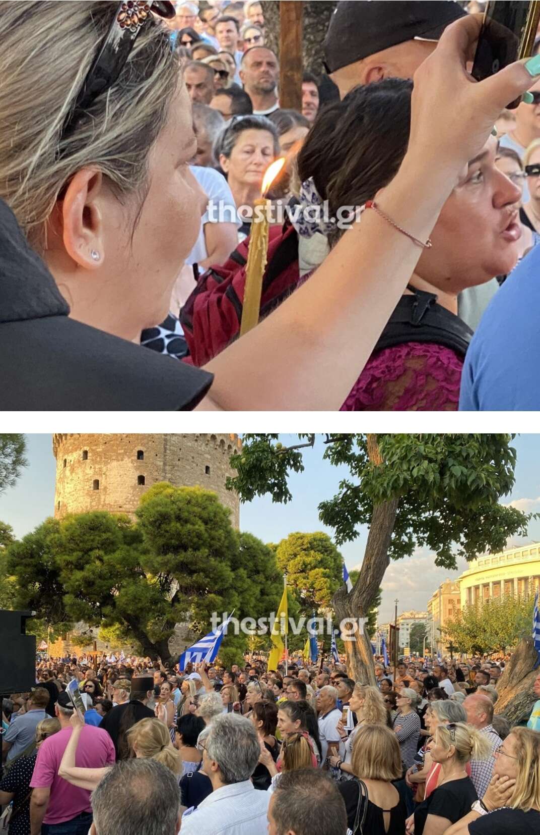 Άνθρωποι όλων των ηλικιών από διάφορες περιοχές βρίσκονται στον Λευκό Πύργο για τη διαμαρτυρία κατά των νέων ταυτοτήτων. Κάποιοι από αυτούς κρατούν ελληνικέσ σημαίες, θρησκευτικές εικόνες, αλλά και αναμμένα κεριά.