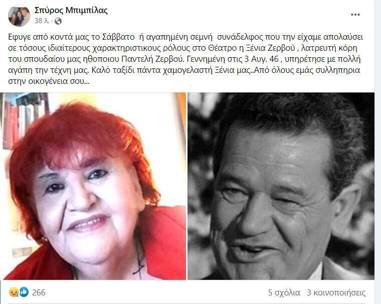 «Έφυγε από κοντά μας το Σάββατο η αγαπημένη, σεμνή συνάδελφος που την είχαμε απολαύσει σε τόσους ιδιαίτερους χαρακτηριστικούς ρόλους στο Θέατρο, η Ξένια Ζερβού, λατρευτή κόρη του σπουδαίου μας ηθοποιού Παντελή Ζερβού.