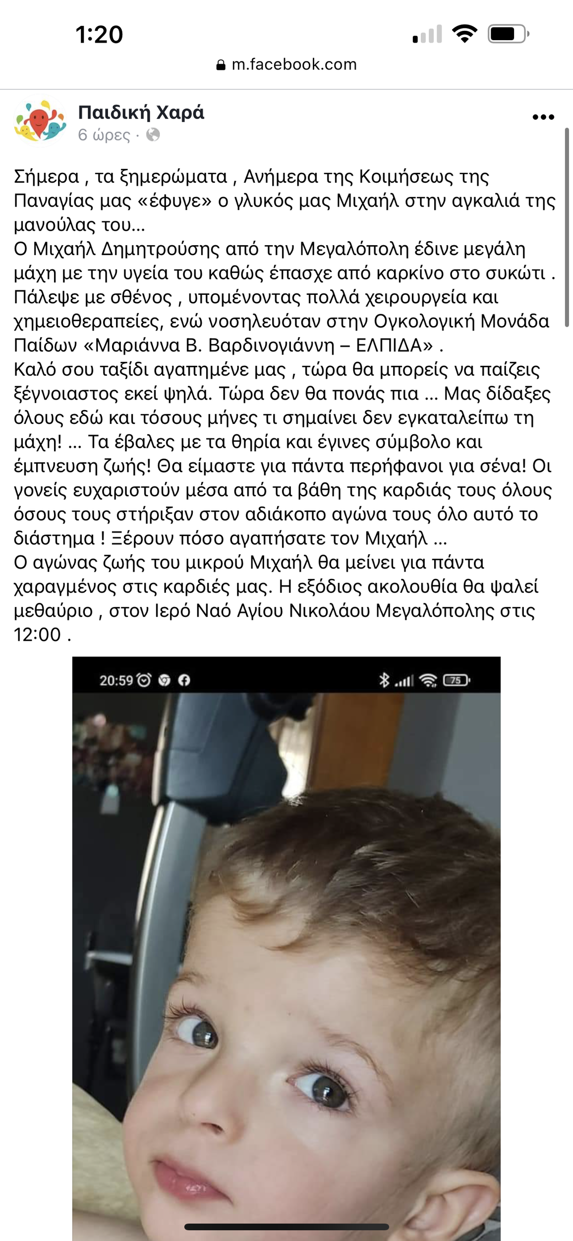 Τον θάνατό του γνωστοποίησε ο Φιλανθρωπικός οργανισμός, Παιδική Χαρά στο Facebook και διευκρίνισε πως ο μικρός Μιχαήλ «πάλεψε με σθένος , υπομένοντας πολλά χειρουργεία και χημειοθεραπείες, ενώ νοσηλευόταν στην Ογκολογική Μονάδα Παίδων “Μαριάννα Β. Βαρδινογιάννη – ΕΛΠΙΔΑ”».