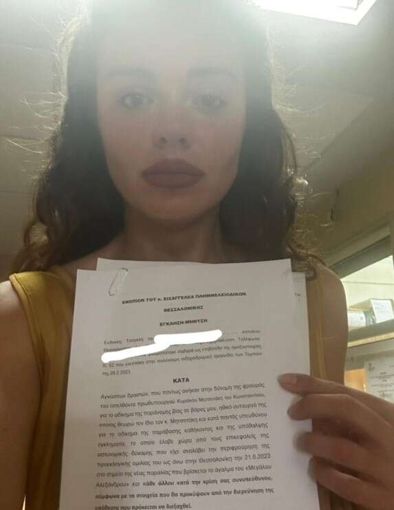 Τώρα ενημερώνει ότι κατέθεσε μήνυση για παράνομη βία κατά της φρουράς του Κυριάκου Μητσοτάκη, που την απομάκρυνε από την ομιλία του προέδρου της ΝΔ, θεωρώντας τον Κυριάκο Μητσοτάκη «ηθικό αυτουργό».