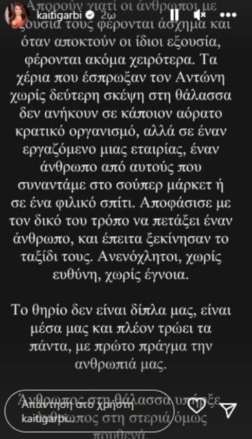 Αποφάσισε με τον δικό του τρόπο να πετάξει έναν άνθρωπο κι έπειτα ξεκίνησαν το ταξίδι τους. Ανενόχλητοι, χωρίς ευθύνη, χωρίς έγνοια. Το θηρίο δεν είναι δίπλα μας, είναι μέσα μας και πλέον τρώει τα πάντα με πρώτο πράγμα την ανθρωπιά μας. Άνθρωπος στη θάλασσα υπήρξε στη στεριά όμως πουθενά», έγραψε η ίδια στον προσωπικό της λογαριασμό ξεσπώντας!