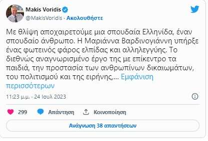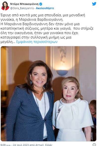 «Τώρα η αγαπημένη μας Μαριάννα Βαρδινογιάννη θα βρει την αγαπημένη της Σόφη εκεί ψηλά. Θα μας στέλνουν την αγάπη τους και το φως τους. Στην μεγάλη και αγαπημένη οικογένεια της τα πιο θερμά μας συλλυπητήρια. Το έργο της υπήρξε εξαιρετικά σημαντικό και άγγιξε όλα τα παιδιά της Ελλάδας. Η ζωή ήταν αφιερωμένη στην οικογένεια και σήμερα θρηνούν όλες οι οικογένειες. Θα θυμάμαι για πάντα τα ζεστά της λόγια στην περίοδο της πανδημίας που μας έδειξαν το φως στη δύσκολη εκείνη περίοδο. Καλό ταξίδι».