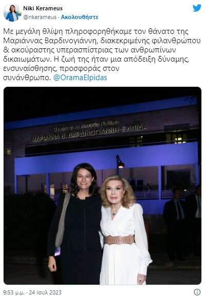 «Με μεγάλη θλίψη πληροφορηθήκαμε τον θάνατο της Μαριάννας Βαρδινογιάννη, διακεκριμένης φιλανθρώπου & ακούραστης υπερασπίστριας των ανθρωπίνων δικαιωμάτων. Η ζωή της ήταν μια απόδειξη δύναμης, ενσυναίσθησης, προσφοράς στον συνάνθρωπο».