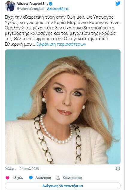 «Είχα την εξαιρετική τύχη στην ζωή μου, ως Υπουργός Υγείας, να γνωρίσω την Κυρία Μαριάννα Βαρδινογιάννη. Ομολογώ ότι μέχρι τότε δεν είχα συνειδητοποιήσει το μέγεθος της καλοσύνης και του μεγαλείου της καρδιάς της. Θέλω να εκφράσω στην Οικογένειά της τα πιο Ειλικρινή μου Συλλυπητήρια! Η Μαριάννα Βαρδινογιάννη είχε αγγελική ψυχή και σε όλη της την ζωή έκανε μόνον καλό στους συνανθρώπους της».