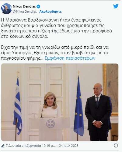 «Η Ελλάδα πενθεί την απώλεια μιας σπουδαίας κυρίας. Η Μαριάννα Βαρδινογιάννη είχε συνδέσει το όνομά της με την προσφορά. Ιδιαίτερα για τα μικρά παιδιά. Με καταγωγή από την ιστορική Ερμιονίδα, η ΜΒ υπήρξε εξαιρετική σύζυγος, μητέρα και διεθνής προσωπικότητα. Το έργο της πάντα θα ζει».