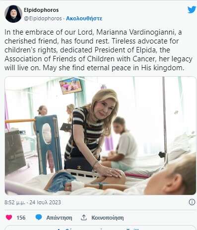 «Στην αγκάλη του Κυρίου μας, η Μαριάννα Βαρδινογιάννη, μια αγαπητή φίλη, βρήκε ανάπαυση. Ακάματη προασπίστρια των παιδικών δικαιωμάτων, αφοσιωμένη πρόεδρος του «ΕΛΠΙΔΑ-Σύλλογος Φίλων Παιδιών με καρκίνο», αφήνει πίσω της κληρονομιά που θα ζει για πάντα. Είθε να βρει την αιώνια γαλήνη στο βασίλειό Του».