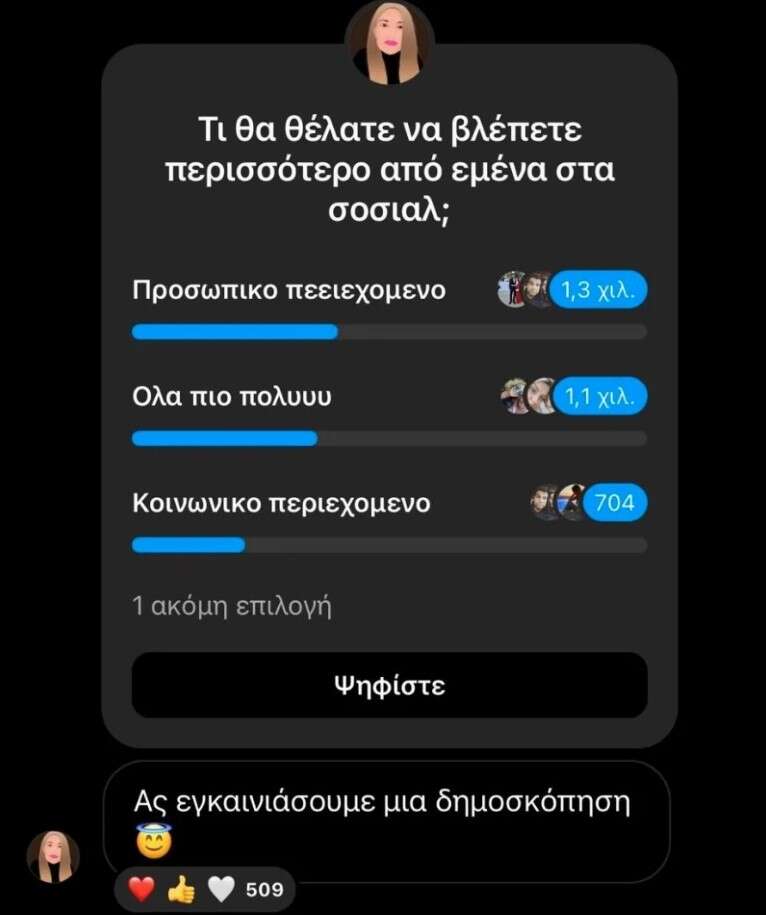 Χαμογελαστή, χαρούμενη και ευδιάθετη, πόζαρε για ακόμη μια φορά σε κοντινή λήψη- πορτρέτο και απέδειξε πως όλα είναι δυνατά αρκεί να τα θελήσεις πολύ και να προσπαθήσεις γι’ αυτά.Δεν είναι η πρώτη φορά που η podcaster μοιράζεται μια τόσο κοντινή λήψη του προσώπου της, αφού έχει κατά καιρούς κοινοποιήσει διάφορες φωτογραφίες στις οποίες μπορούμε να διακρίνουμε ξεκάθαρα την ταχύτατη ανάρρωσή της.Στο πλαίσιο αυτού του νέου διαύλου επικοινωνίας που άνοιξε η Ιωάννα Παλιοσπύρου με τους ακόλουθούς της, ένιωσε την ανάγκη να ρωτήσει και τους ίδιους την άποψή τους ως προς το τι θα ήθελαν να βλέπουν από εκείνη στο Ioanna’s Place.Στη δημοσκόπηση που έκανε, το μεγαλύτερο μέρος απάντησε «προσωπικό περιεχόμενο», ακολούθησε η επιλογή «όλα πιο πολύ» και έπειτα αυτή του κοινωνικού περιεχομένου.