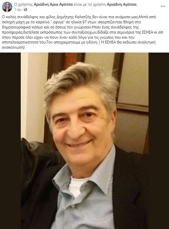 «Το Διοικητικό Συμβούλιο της ΕΣΗΕΑ αποχαιρετά με θλίψη τον συνάδελφο Δημήτρη Καλαντζή (του Θεοδώρου), ο οποίος έχασε τη μάχη με τον καρκίνο σε ηλικία 68 ετών.