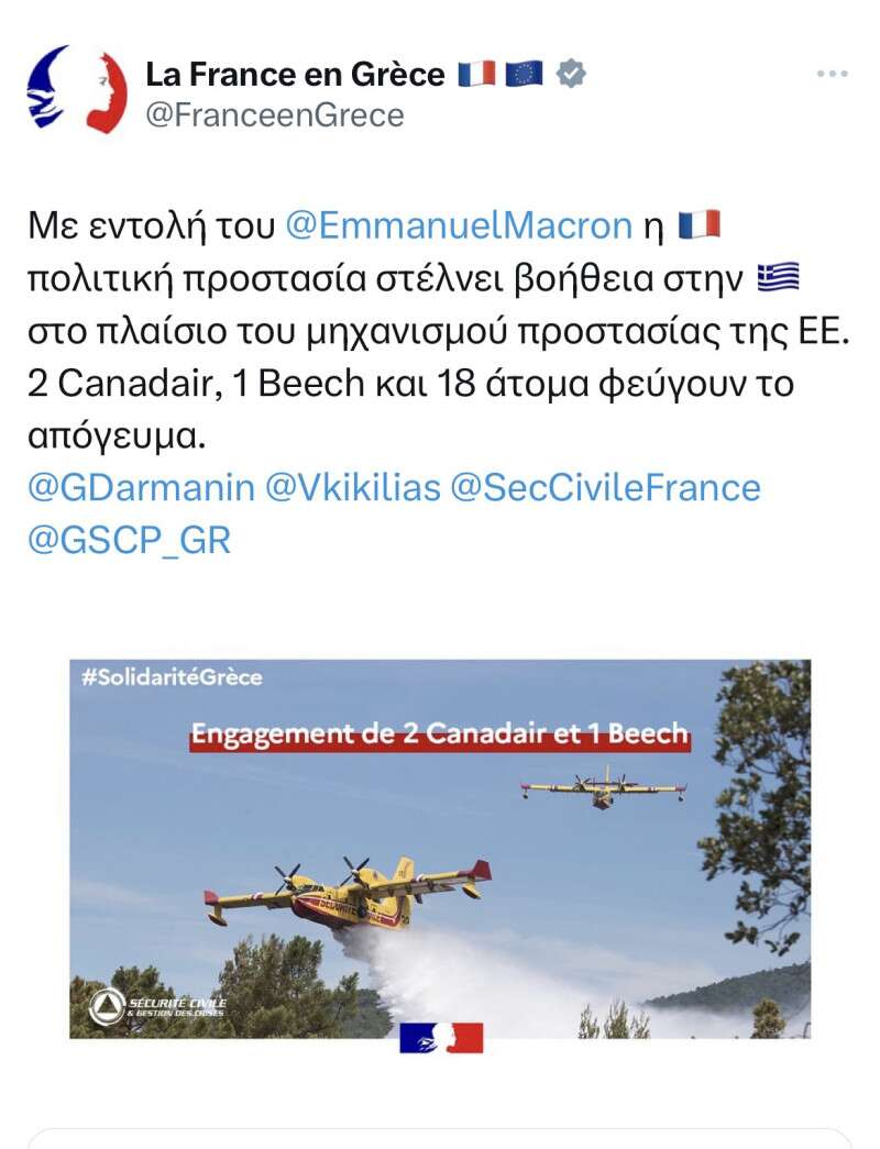 Ο Ζεράρ Νταρμανέν, υπουργός Εσωτερικών της Γαλλίας, έκανε την ανακοίνωση για την γαλλική αποστολή των Canadair. Πιο συγκεκριμένα, στην Ελλάδα θα φτάσουν από την Γαλλία, δύο Canadair, ένα αναγνωριστικό αεροπλάνο και δεκαοχτώ πυροσβέστες για να βοηθήσουν στην κατάσβεση των πυρκαγιών.