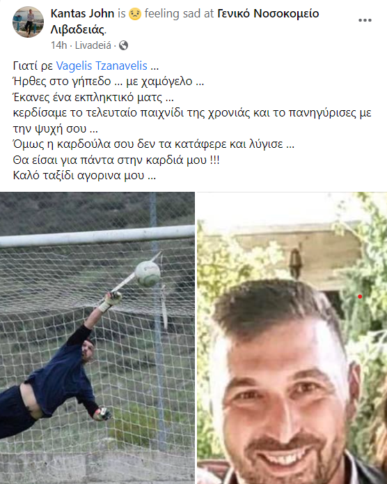 Ανείπωτη είναι η θλίψη στην Βοιωτία και στο ερασιτεχνικό ποδόσφαιρο με τον θάνατο του 37χρονου Βαγγέλη Μπαρμπέρη. Ο άνδρας ήταν τερματοφύλακας του ΑΣ Χωστίων και άφησε την τελευταία του πνοή το βράδυ της Κυριακής (28/5). Όπως σημειώνει ο φίλος του και δημοσιογράφος Γιάννης Καντάς, το απόγευμα της ίδιας μέρας πανηγύρισε τη νίκη της ομάδας του, μετά από καταπληκτική εμφάνιση κόντρα στο Δίστομο, αλλά λίγο αργότερα η καρδιά του δεν άντεξε.