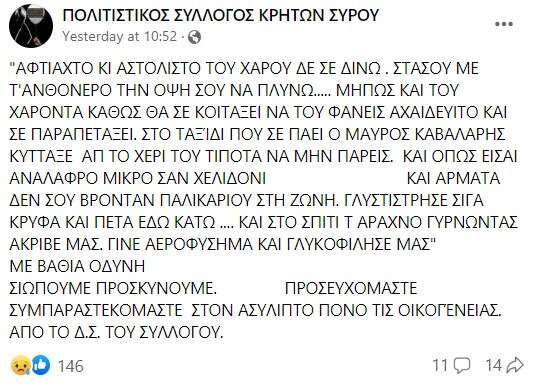 Συντετριμμένη η Πρόεδρος του Πολιτιστικού Συλλόγου Κρητών Σύρου, κ. Ειρήνη Φουντουλάκη, μίλησε στο Cretalive για το χτύπημα της μοίρας που δέχθηκε η οικογένεια των Κρητικών… “Τι μπορεί να πει κανείς σε αυτούς τους ανθρώπους; Σε αυτούς τους γονείς που έχασαν το αγγελούδι τους; Είμαστε όλοι συγκλονισμένοι. Κουράγιο και δύναμη, τίποτε άλλο”, ανέφερε χαρακτηριστικά, μη μπορώντας να κρύψει τη συγκίνησή της.