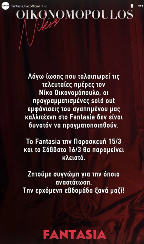 «Λόγω ίωσης που ταλαιπωρεί τις τελευταίες ημέρες τον Νίκο Οικονομόπουλο, οι προγραμματισμένες sold out εμφανίσεις του αγαπημένου μας καλλιτέχνη στο Fantasia δεν είναι δυνατόν να πραγματοποιηθούν. Το Fantasia την Παρασκευή 15/3 και το Σάββατο 16/3 θα παραμείνει κλειστό. Ζητούμε συγγνώμη για την όποια αναστάτωση. Την ερχόμενη εβδομάδα ξανά μαζί» αναφέρει χαρακτηριστικά η ανακοίνωση του νυχτερινού κέντρου.