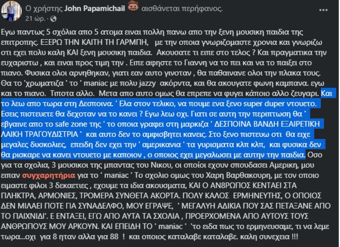 Αρχικά έγραψε: «Εγώ πάντως 5 σχόλια από 5 άτομα είναι πολύ πάνω από την ξένη μουσική παιδεία της επιτροπής. ΞΕΡΩ ΤΗΝ ΚΑΙΤΗ ΤΗ ΓΑΡΜΠΗ, με την οποία γνωριζόμαστε χρόνια και γνωρίζω ότι έχει πολύ καλή και ξένη παιδεία. Ακούσατε τι είπε στο τέλος ? Και πραγματικά την ευχαριστώ , και είναι προς τιμήν την . Είπε αφήστε το Γιάννη να το πει και να το παίξει στο πιάνο. Φυσικά όλοι αρνήθηκαν, γιατί εάν αυτό γινόταν , θα παθαίνανε όλοι την πλάκα τους. Θα το ‘χρωματιζα ‘ το ‘ maniac με πολυ jazzy ακόρντα, και θα ακούγατε φωνή καμπάνα».