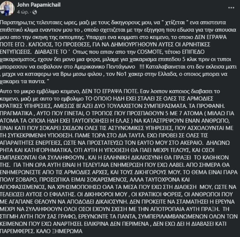 Σε ένα μακροσκελές κείμενο, έγραψε, μεταξύ άλλων: «Υπάρχει ένα κομμάτι στο κείμενο, το οποίο ΔΕΝ ΕΓΡΑΨΑ ΠΟΤΕ ΕΓΩ . ΚΑΠΟΙΟΣ, ΤΟ ΠΡΟΣΘΕΣΕ, ΓΙΑ ΝΑ ΔΗΜΙΟΥΡΓΗΘΟΥΝ ΑΥΤΕΣ ΟΙ ΑΡΝΗΤΙΚΕΣ ΕΝΤΥΠΩΣΕΙΣ. ΔΙΑΒΑΣΤΕ ΤΟ “Όπως μου είπαν, τέτοιο επίπεδο χακαρίσματος, έχουν δει μόνο μια φορά, μιλάμε για χακάρισμα επιπέδου 5 κλικ πριν οι τύποι μπορέσουν να εισβάλουν στο Αμερικανικό Πεντάγωνο!!! Καταλαβαίνετε ότι δεν έκλεισα μάτι, μέχρι να καταφέρω να βρω μέσω φίλου, τον Νο1 χάκερ στην Ελλάδα, ο οποίος μπορεί να χακάρει τα πάντα”».