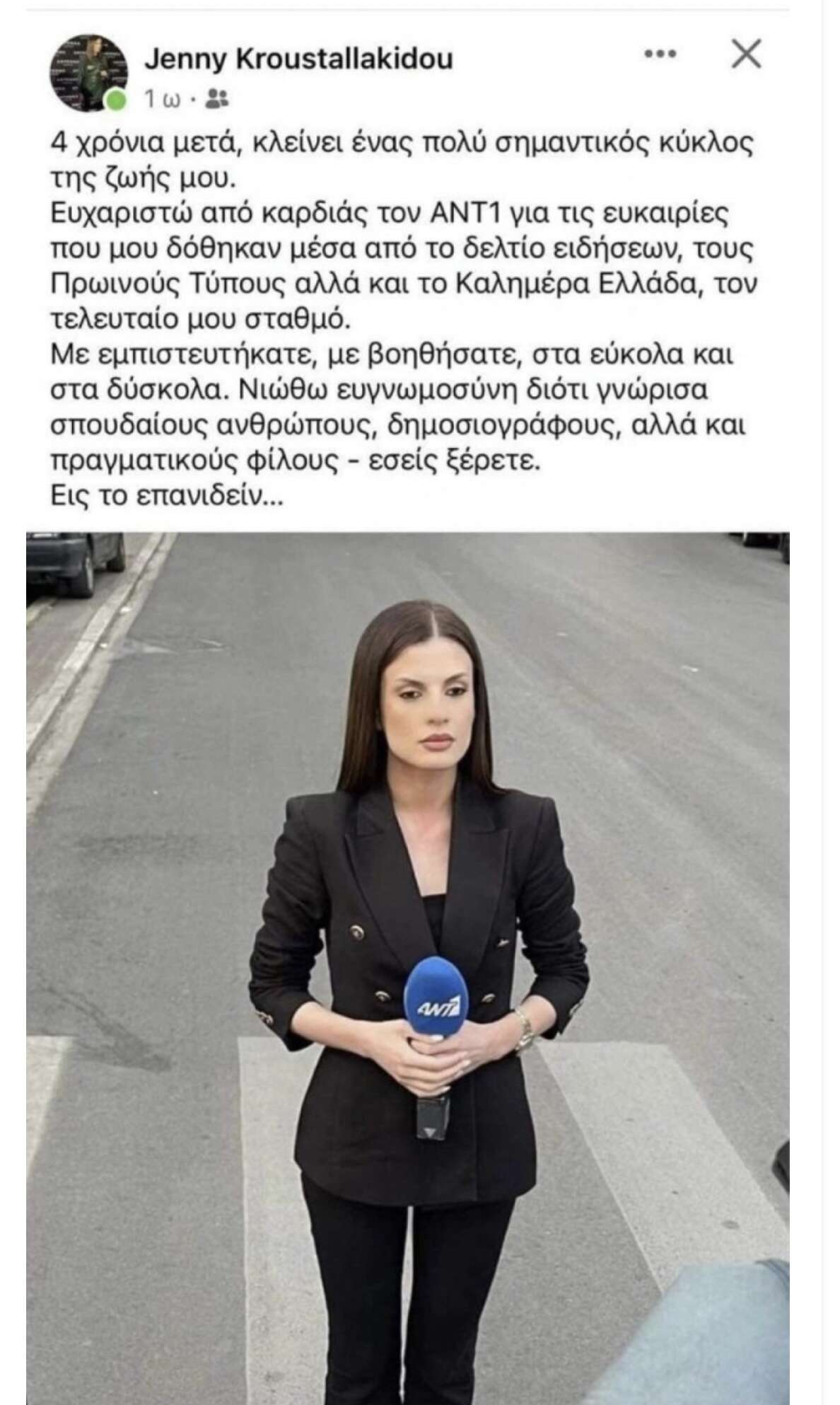 Πιο συγκεκριμένα, η Τζένη Κρυσταλλακίδου ανέφερε σε ανάρτησή της στο facebook: «4 χρόνια μετά, κλείνει ένας πολύ σημαντικός κύκλος της ζωής μου. Ευχαριστώ από καρδιάς τον ΑΝΤ1 για τις ευκαιρίες που μου δόθηκαν μέσα από το δελτίο ειδήσεων, τους “Πρωινούς Τύπους” αλλά και το “Καλημέρα Ελλάδα”, τον τελευταίο μου σταθμό.