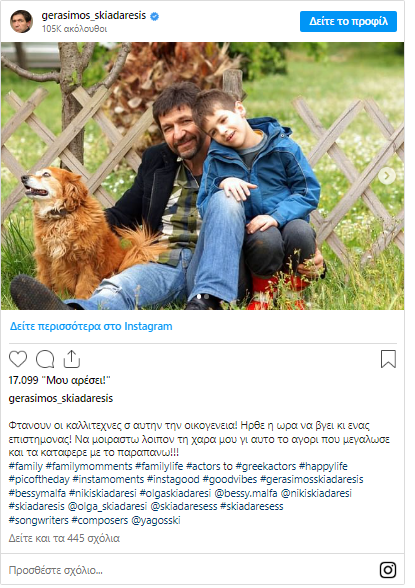 Ο Γεράσιμος Σκιαδαρέσης ανέβασε με τη σειρά του δύο φωτογραφίες, στις οποίες ποζάρει με τον Γιάγκο και έγραψε στη λεζάντα: “Φτάνουν οι καλλιτέχνες σε αυτήν την οικογένεια! Ήρθε η ώρα να βγει κι ένας επιστήμονας! Να μοιραστώ λοιπόν τη χαρά μου γι’ αυτό το αγόρι που μεγάλωσε και τα κατάφερε με το παραπάνω!!!”.