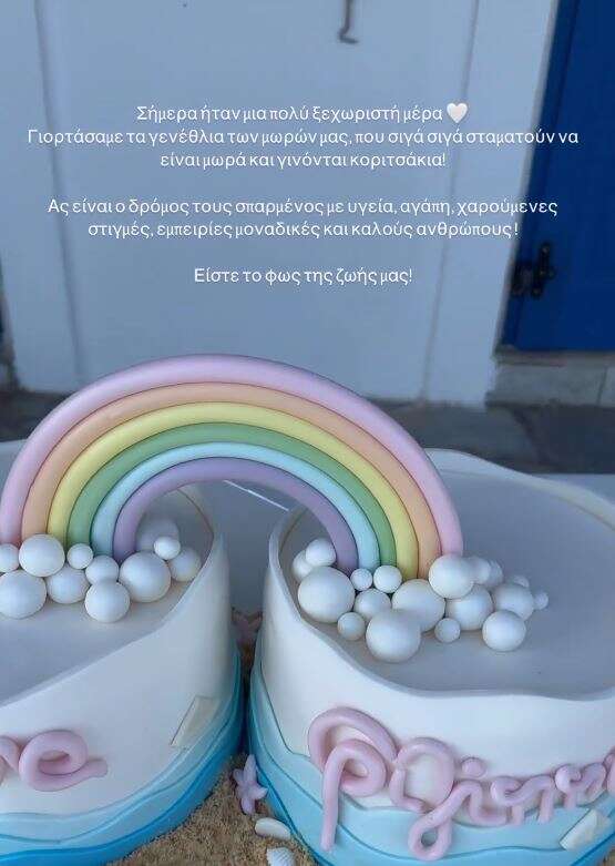 Λίγο πριν τις 12 τα μεσάνυχτα, η Χριστίνα Μπόμπα δημοσίευσε ένα βίντεο από τα γενέθλια της Αριάνας και της Φιλίππας και ευχήθηκε στα κορίτσια της με τα πιο τρυφερά λόγια: «Σήμερα ήταν μια πολύ ξεχωριστή ημέρα. Γιορτάσαμε τα γενέθλια των μωρών μας, που σιγά σιγά σταματούν να είναι μωρά και γίνονται κοριτσάκια! Ας είναι ο δρόμος τους σπαρμένος με υγεία, αγάπη, χαρούμενες στιγμές, εμπειρίες μοναδικές και καλούς ανθρώπους. Είστε το φως της ζωής μας!».