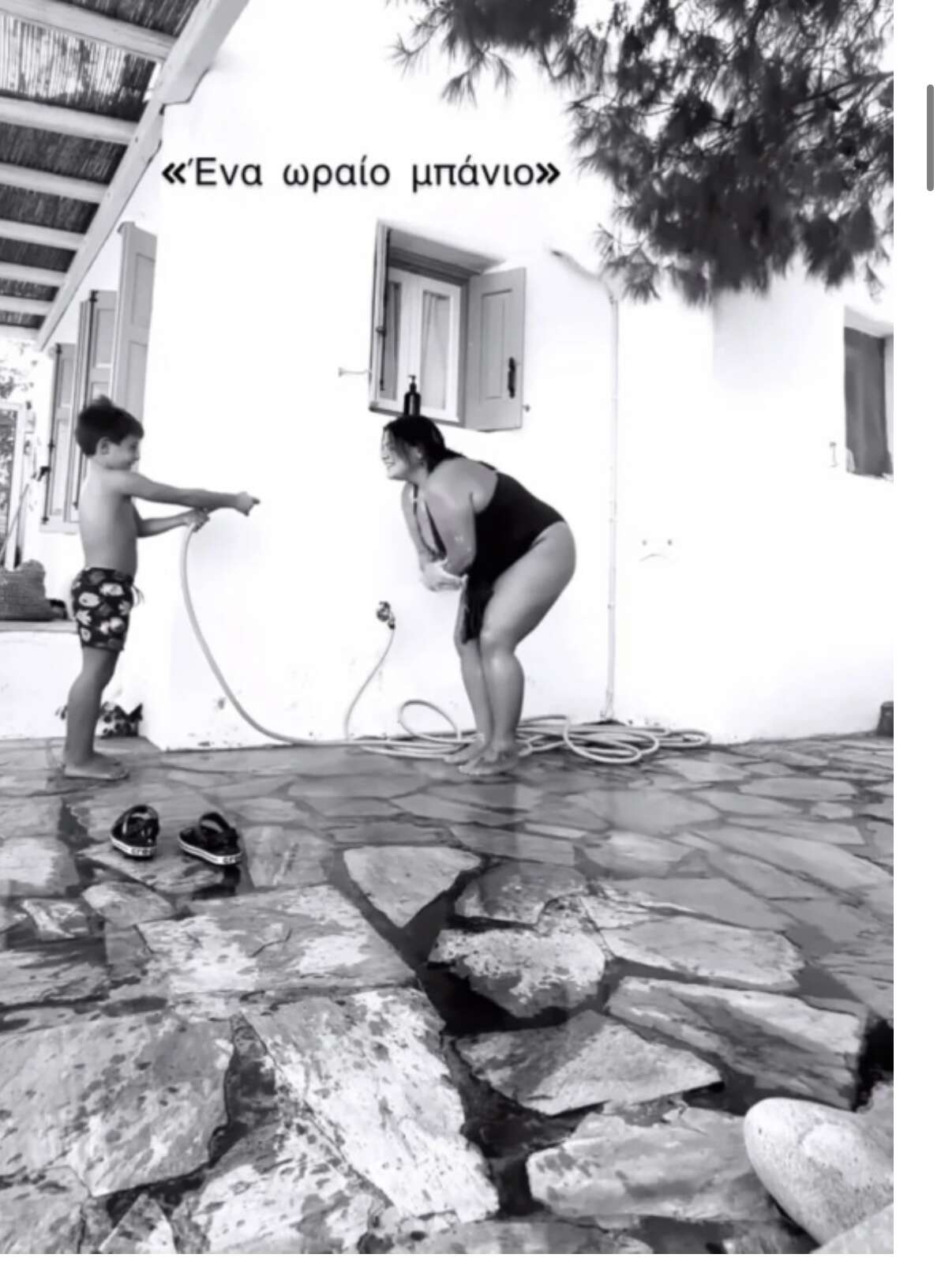 «Αποφασίσαμε με τον Ίωνα να κάνουμε μπάνιο με το λάστιχο έξω αντί για την ντουζιέρα. Όταν ήμουν μικρή, στις διακοπές ήταν σχεδόν «κανονικότητα» το μπάνιο στην αυλή ή στις ταβέρνες με λάστιχα αν ήμασταν σερί έξω, ή στον κήπο της γιαγιάς μου, ή ακόμα κι αν δεν είχαμε πάει θάλασσα πάλι το τολμούσαμε.