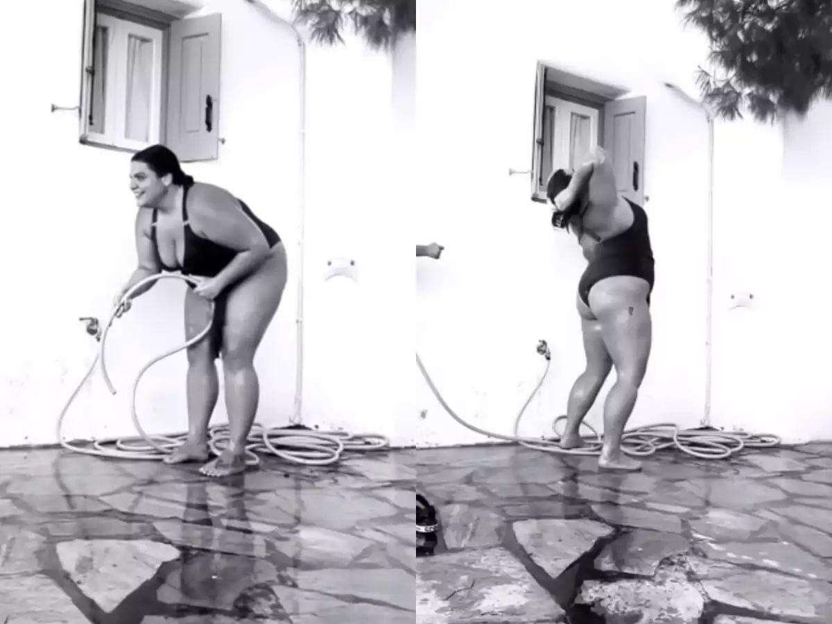 Το απόγευμα της Κυριακής, η παρουσιάστρια φόρεσε το ολόσωμο μαγιό της και έκανε μπάνιο στην αυλή… με το λάστιχο φέρνοντας μας αναμνήσεις από τα παιδικά μας χρόνια.