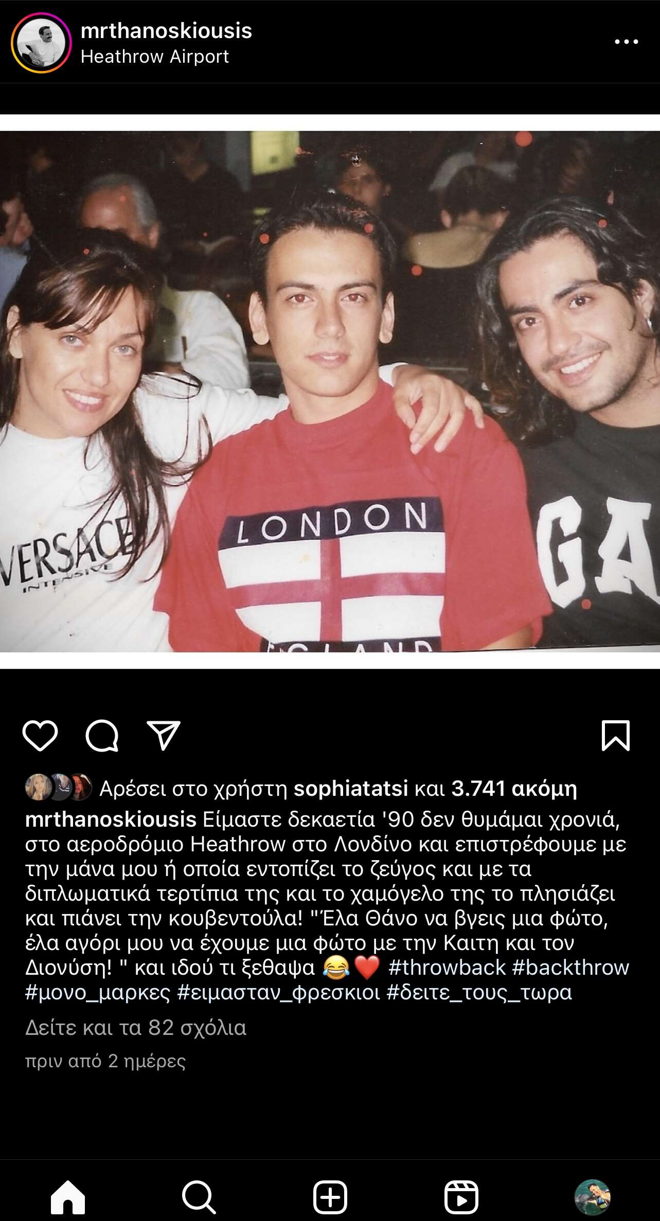 Μάλιστα συνόδευσε την ανάρτησή του με την εξής λεζάντα: «Είμαστε δεκαετία ’90, δεν θυμάμαι χρονιά, στο αεροδρόμιο Heathrow στο Λονδίνο και επιστρέφουμε με τη μάνα μου, η οποία εντοπίζει το ζεύγος και με τα διπλωματικά τερτίπια της και το χαμόγελό της το πλησιάζει και πιάνει την κουβεντούλα! “Έλα Θάνο να βγεις μια φώτο, έλα αγόρι μου να έχουμε μια φώτο με την Καίτη και τον Διονύση!” και ιδού τι ξέθαψα».