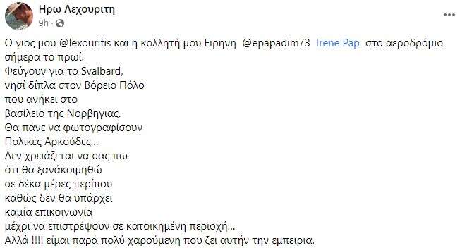 «Ο γιος μου @lexouritis και η κολλητή μου Ειρηνη @epapadim73 Irene Pap στο αεροδρόμιο σήμερα το πρωί. Φεύγουν για το Svalbard,νησί δίπλα στον Βόρειο ΠόλοΘα πάνε να φωτογραφίσουν Πολικές Αρκούδες… Δεν χρειάζεται να σας πω ότι θα ξανάκοιμηθώσε δέκα μέρες περίπου καθώς δεν θα υπάρχει καμία επικοινωνία μέχρι να επιστρέψουν σε κατοικημένη περιοχή…Αλλά !! είμαι παρά πολύ χαρούμενη που ζει αυτήν την εμπειρια».