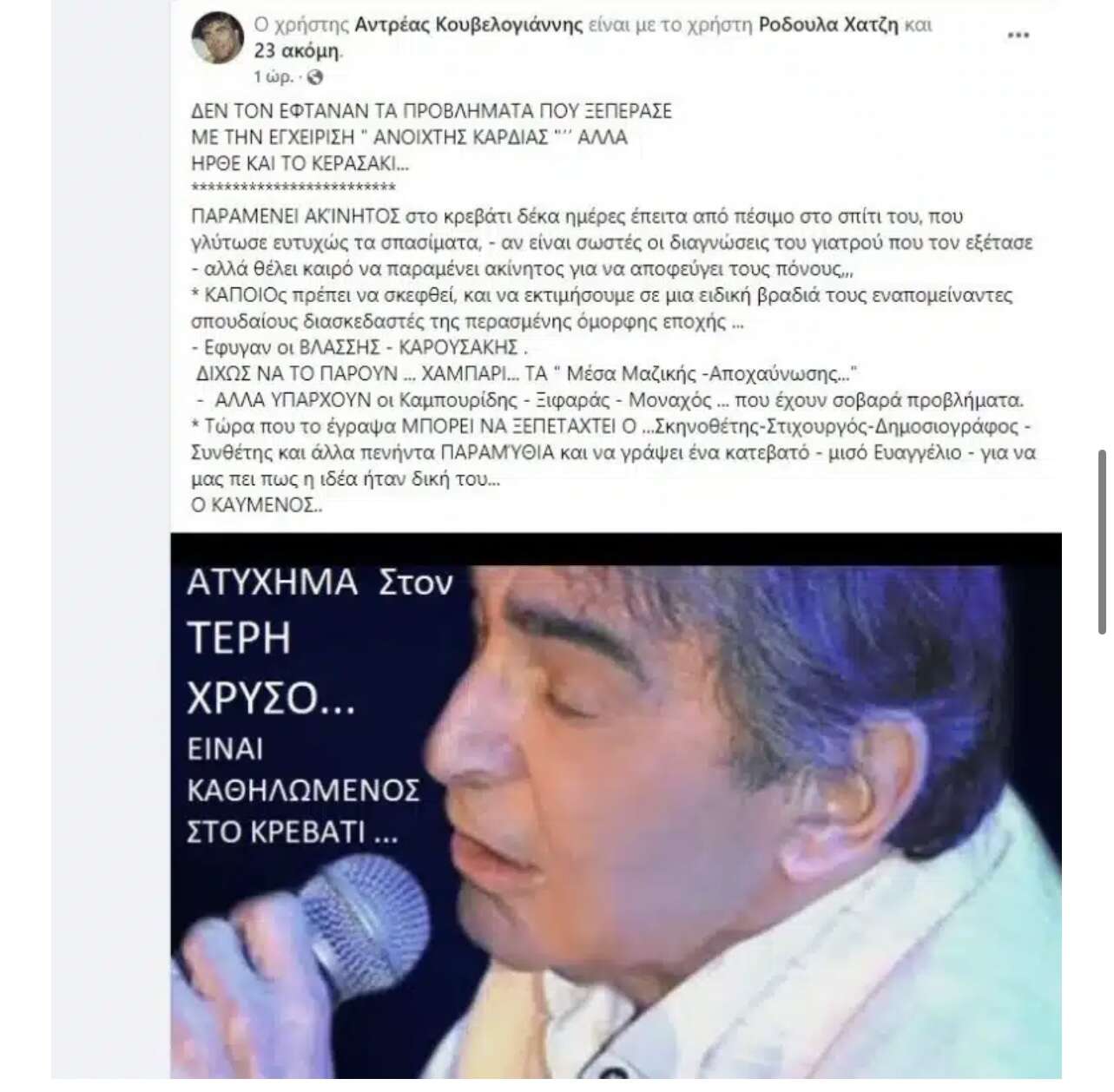 Δύσκολες ώρες για τον Τέρη Χρυσό, ο οποίος βρίσκεται τις τελευταίες μέρες καθηλωμένος στο κρεβάτι.