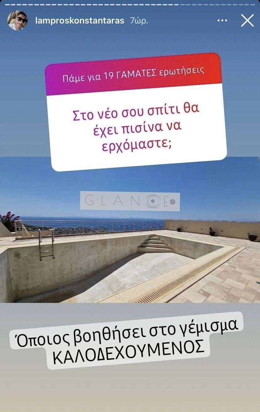 Ο δημοσιογράφος Λάμπρος Κωνσταντάρας παρουσίασε μέσα από τα social media του το νέο του σπίτι, το οποίο βρίσκεται στη Σαρωνίδα και όπως φαίνεται η εντυπωσιακή κατοικία έχει πισίνα και θέα το απέραντο γαλάζιο.