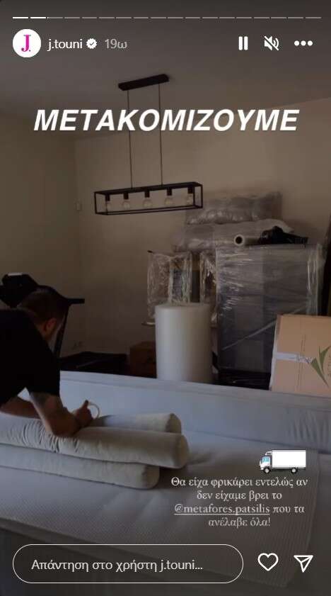 «Σε περίπτωση που δεν καταλάβατε από τα προηγούμενα stories, μετακομίζουμε!», αποκάλυψε η Ιωάννα Τούνη.
